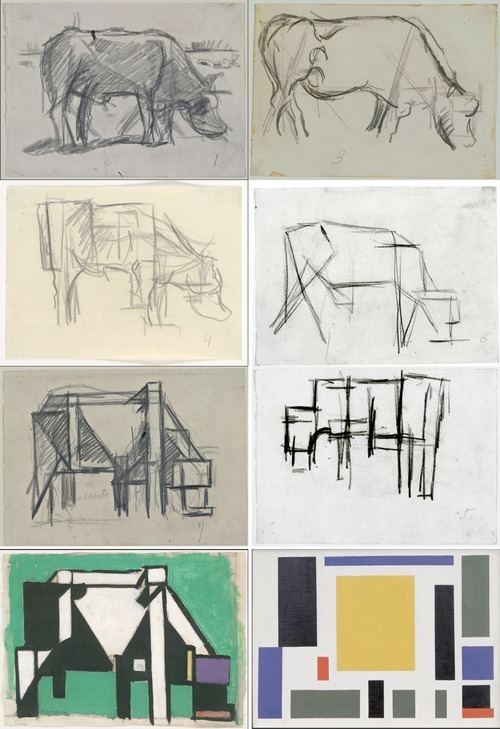 ついで、ヨーロッパ起源の抽象とアメリカの抽象との違いを述べる下りがある。ヨーロッパの抽象は現実世界からの段階的な抽象であり、最終段階でどんなに幾何学的な抽象形態をとっていたとしても、それは現実に戻る道がまだ残されている。それに対して、アメリカの抽象はシュルレアリズムの自動書記によったとされる。意識的制御を廃した、自発的ないたずら描き、すなわちアクションによるアーティストの内的な自己と直結する表現であった。こういった分かりやすい説明は、ハイそうですか、と読んでいけばいい。しかし、ヨーロパ起源の抽象の作例として、テオ・ファン・ドゥースブルグ【Theo van Doesburg 1883-1931】の『雌牛』(c.1917) が取り上げられていて、ダントはその説明をユーモアを交えて行なっているのだが、その記述でダントはちょっとした勘違いをしていたので、せっかくだからここでダントに代わって訂正しておこうと思う。