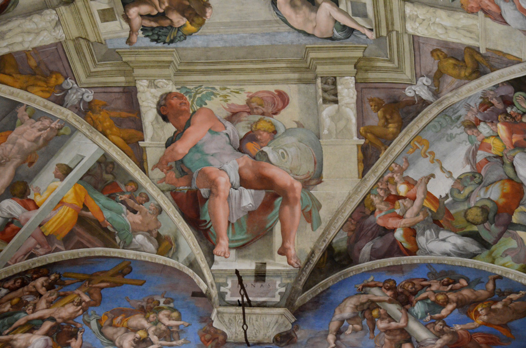 遠近法と短縮法を駆使して描かれたヨナのイメージは、アクロバット的なミケランジェロの離れ業によって表現されていること、そのことは引用したコンディヴィの文章からよく理解することができる。しかしそれを図版で確かめようとすると、いまひとつよく分からない。ヨナが描かれている支持体の形状が図版から読み取れないのである。引用文によると、「三角形のくぼみ」とあるが、それがどのようにくぼんでいるのか、見て取れないからである。だからヨナのトルソが私たちの眼に最も近い部分であり、こちら側に突き出ている脚が、眼からもっとも遠い、という事実が確認できない。これは実際にこの天井画を実見しないと確認のしようがないようである。少し欲求不満気味であるが仕方がない。しかし言葉の上ではよく理解できる。支持体の空間的構造と描かれたイメージの遠近表現が逆になっているという、あたかも手品を見るような、視覚のアクロバットをミケランジェロがやり遂げている。ヨナが天井画の物理的な壁面特性から逃れようと格闘しているというダントの解釈は、ミケランジェロの短縮法と同じように、思考におけるアクロバットとして、驚嘆に値する。